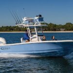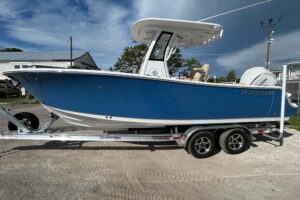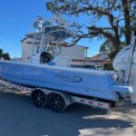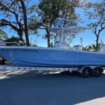 Very Clean and Well Maintained Robalo Cayman 266 SkyDeck with a Yamaha 425 HP with 215 hours and warranty until 4/1/2030. Robalos Photo Shoot Boat, Photos are the actual boat. Loaded with almost every option including twin 12″ Simrad GPS/Fish Finders, Upgraded JL Stereo System, Simrad VHF Radio, Custom Forward Sunshade, Stainless Steel Drink/Rod Holders, Jack Plate, Underwater Lights, Trim Tabs with Indicators, Twin MinnKota Raptor Power Poles, Trolling Motor with Charger, Forward Table with Filler Cushion, Forward Backrest and Cushion Package, Three Large Live Wells, Twin Swim Platforms with Built in Step. Tandem Axle Coyote Trailer also included
