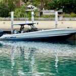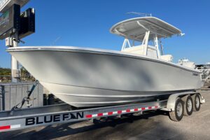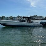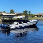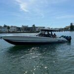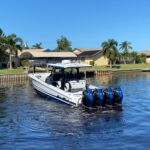 This Nor-Tech 400 SuperSport Center Console is in absolutely pristine condition and comes with the Evolution Trailer!!! Here is your opportunity to get into one of the most desirable Hi-Performance Center Consoles in the industry. The 400 SuperSport is a hard boat to get a hold of, not many are built and this one is among the most well equipped 40’s that have been built. It has been meticulously maintained and stored on a covered lift and in an Air Conditioned Garage since new. The boat has an amazing power package with the Quad Mercury Racing 500 R’s which pushes up to speeds of about 95 MPH! There are only about 100 hours on the engines. The engines have Mercury Platinum Warranty on them till 12/ 1/ 2028! The paint job is incredible and consists of a very pretty Pearl Metallic White on the Hull Sides, Deck & Interior walls. The stripes are done with an Electric Metallic Blue and Sterling Grey Metallic. This boat is loaded with some very nice Features Including Air Conditioning in the Cabin with a separate enclosed Head. It also has a FLIR Night vision Camera, (2) Garmin 22″ Screens, Bow Thruster, Apple TV, Auto Pilot, XM Weather / Radio, 24″ Radar Dome, & a 30″ Light Bar. The boat has the Second Row Seating set up so people feels safe & comfortable running along at any speed. You have great visibility and control. There is comfortable seating all over the boat and all the upholstery is in perfect condition. There is a Sure Shade (Power Retractable Shade) in the Hard Top which extends about 7′ and gives you a ton of shade in the back and covers the Club Sport Seating in the back. The boat is equipped with the Marine Guardian Security System to track the boat and it will alert you when someone boards as well. This is the perfect boat for doing anything from running around hitting the local hot spots to doing long runs in the Bahamas. It is an easy boat to take care of and has the amenities to keep you comfortable on long trips. Other options include, (4) Underwater Lights RGB, Huge JL Audio Stereo w/ LED Lighting RGB, VHF Radio, Zero Effort Controls, Painted Engines, 1KW Transducer, Sea Deck Flooring, Electric Bow Table, & Forward Facing Bow Backrests.