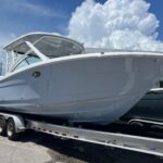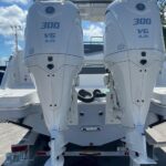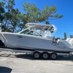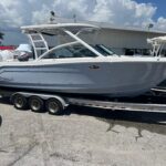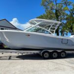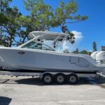 This Robalo 317 Dual Console is a show stopper with it’s Alloy Grey Hull Sides & Bottom! It is powered by twin Yamaha 300 HP 4-Strokes w/ Digital Throttle & Shift as well as Electric Power Steering. This Power Package also has the optional Yamaha Helm Master Joystick Piloting System w/ Full Maneuverability and Auto Pilot. If you are looking for a boat that can do it all but with an emphasis on Entertaining and Comfort then this is the perfect boat for you! The boat has many areas to layout and relax in the shade or in the sun. The Hard Top is very large and has a Retractable Rear Sun Shade (Sure Shade) that covers the whole rear Lounge / Seat. The Rear Seat has electric Backrests that allow it to convert from a dual sided bench seat to a large Lounge with capability to recline forwards, backwards, or lay all the way down. The boat also has a Very nice Live Bait Well and large Fish Box / Cooler. Other options include the Simrad 16″ GPS / Fish Finder, JL Audio Stereo Upgraded System, VHF Radio, Cockpit Gas Grill, Wetbar, Toilet w/ Overboard Discharge, Polish Stainless Anchor, Bow & Cockpit Cover, (2) Stainless Rod / Cup Holders, and 5 Year Premium Level Limited Component Warranty.