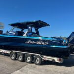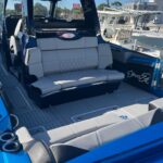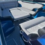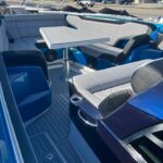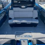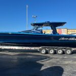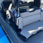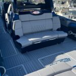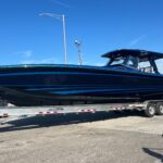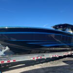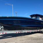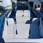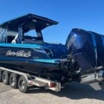 This Nor-Tech 450 Sport Center Console is here at the dealership right now and it is absolutely beautiful! The boat has a Sea Keeper 6 Gyro Stabilizer in it and is powered by Quad 500 HP Mercury Racing Engines. The boat has two Garmin 9622’s flush mounted in the dash, Auto Pilot, FLIR Night Vision, Radar, VHF Radio, XM Weather & Radio, and 1KW Transducer. It has the Upgraded Premium Stereo System and the Sure Shade – Power Retractable. The cabin is Air Conditioned and has an enclosed Head & Shower. It has large windows that give you a very open feel inside. The seating in the rear of the boat is very large and comfortable. There is a Northern Lights Generator – Diesel, which is in an easily accessible compartment under the rear seat. The bow has the Electric Table and a Bow Thruster. There is Sea Deck flooring throughout the boat. Custom Painted Graphics, Paint console, Helm Seat, & Interior walls. The engines are hooked up to a Reverso Flush System making it very easy to flush the engines. Other options include, Bar w/ Cold Plate, Marine Guardian Security System, Black Oak LED Light Bar, & Underwater Lights color changing.