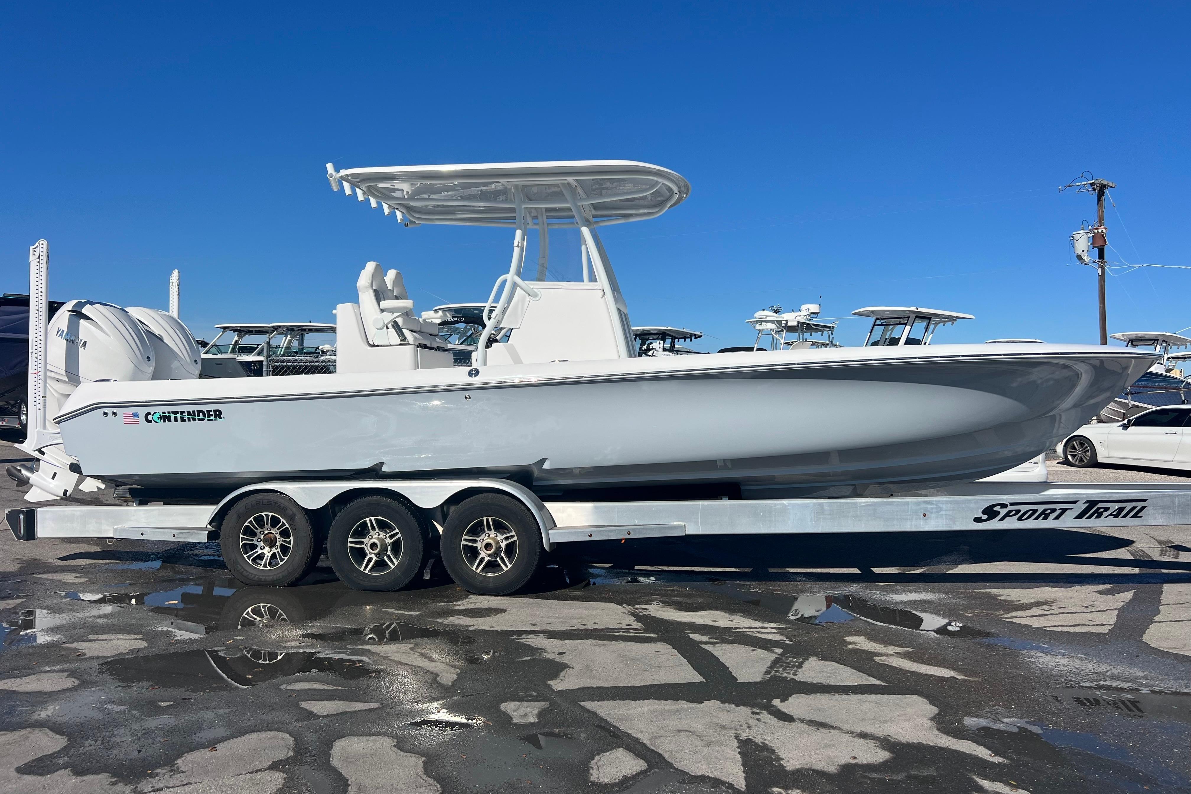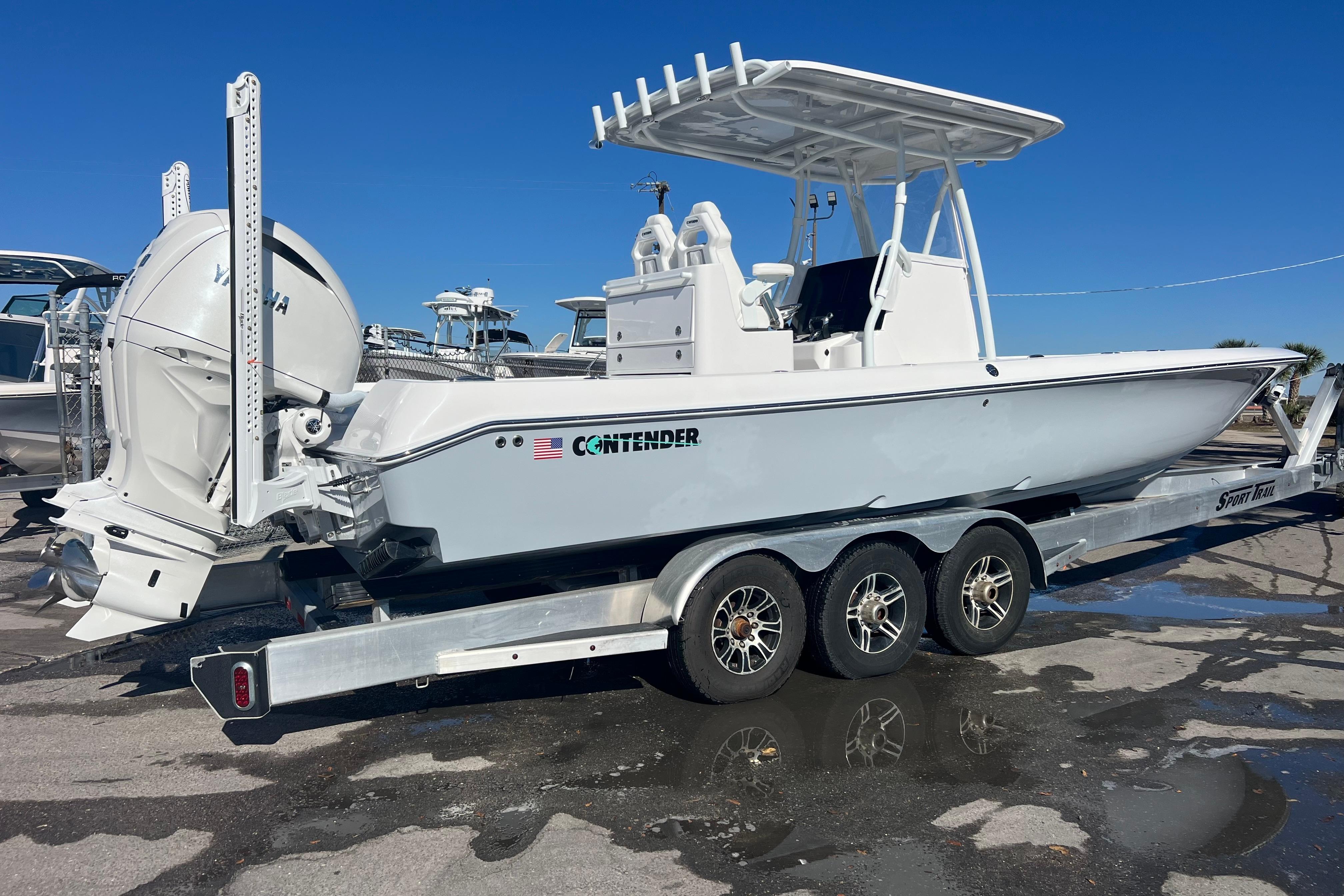 We are very excited to have the new Contender 29 Bay in stock now! This boat is powered by twin Yamaha 300 HP 4-Strokes with Digital Throttle & Shift. It is equipped incredibly well with Sea Keeper RIDE, Twin Power Pole 10' Blades, Dual Garmin 16" Displays, & Stereo w/ JL Audio Speakers. The Sea Keeper RIDE is an Automatic Trim Tab System that keeps the boat stable while underway. It works so well, you have to try it. Sitting at the helm is a great experience, the console is absolutely beautiful. The two Llebroc Helm Chairs are super comfortable and look amazing. The seats are on electric sliders so you can decide how far you want to sit from the steering wheel. The layout is super versatile as it has a ton of open space keeping the fishability very high while still having great seating. The interior is very impressive but what really makes this boat fun is how it performs in the water. It will out perform any boat in its class. The 29 Bay is fast, solid, smooth & dry, and gives you the confidence to run offshore as well as inshore. If you are in the market for a hybrid style Center Console you have to try this one out.