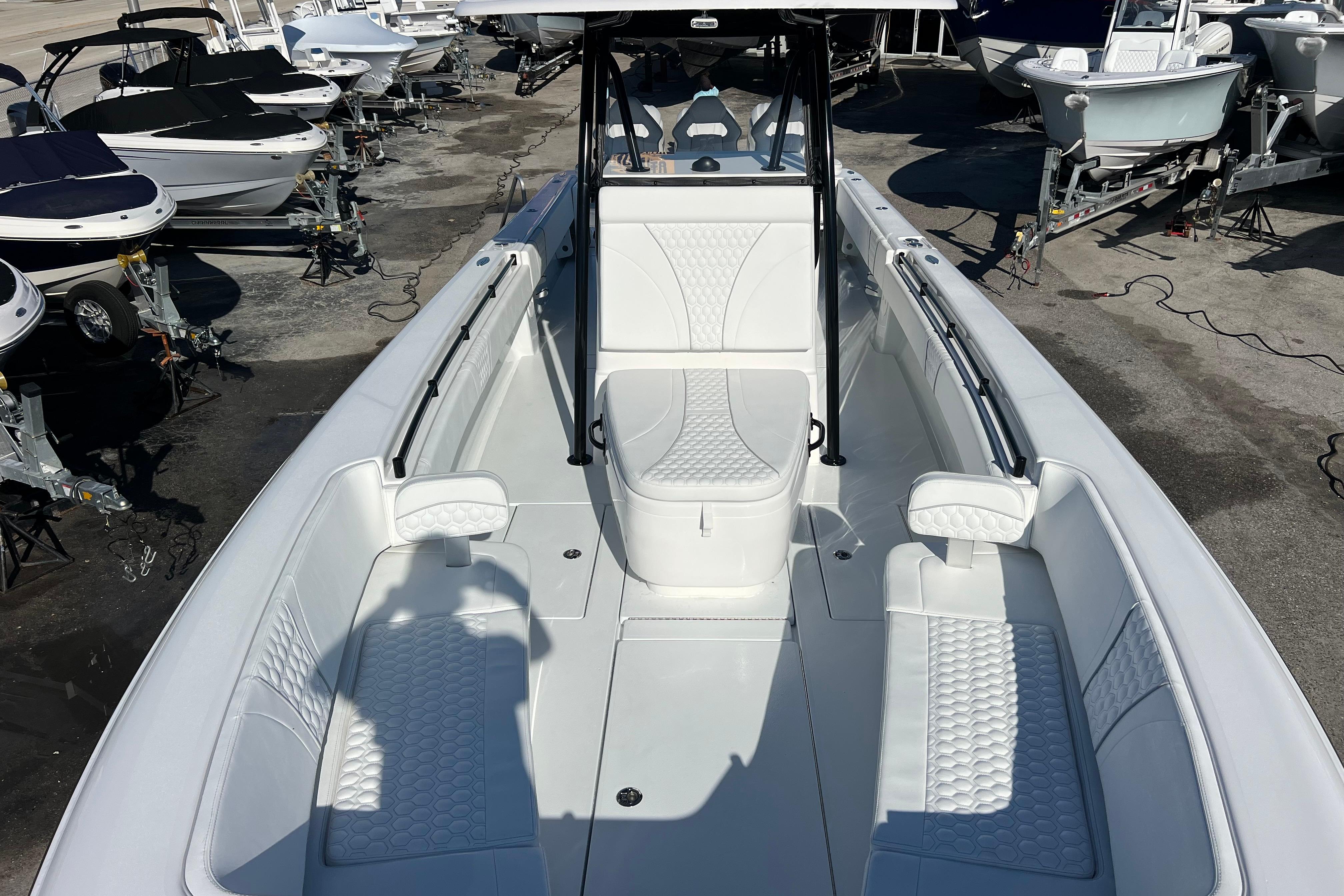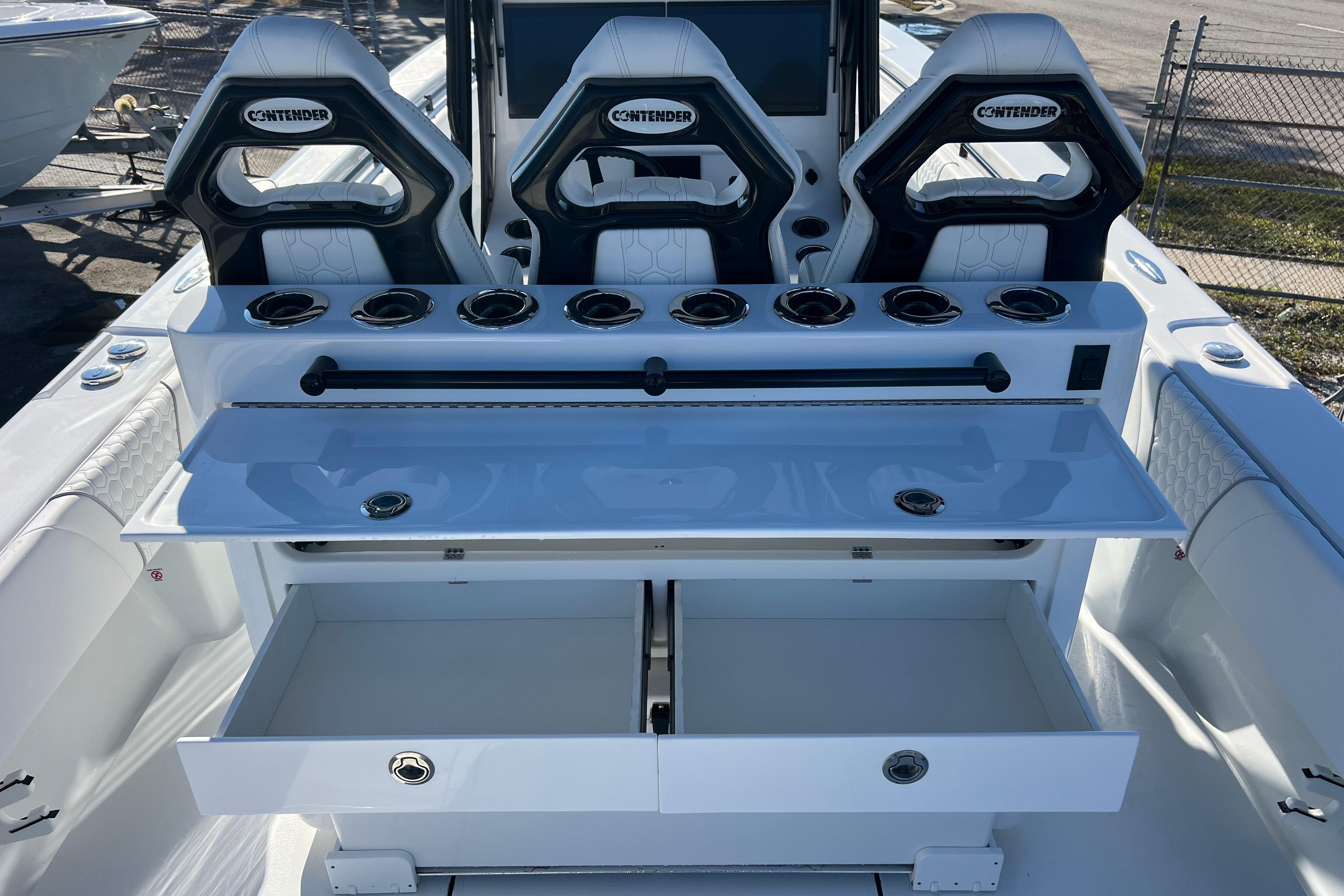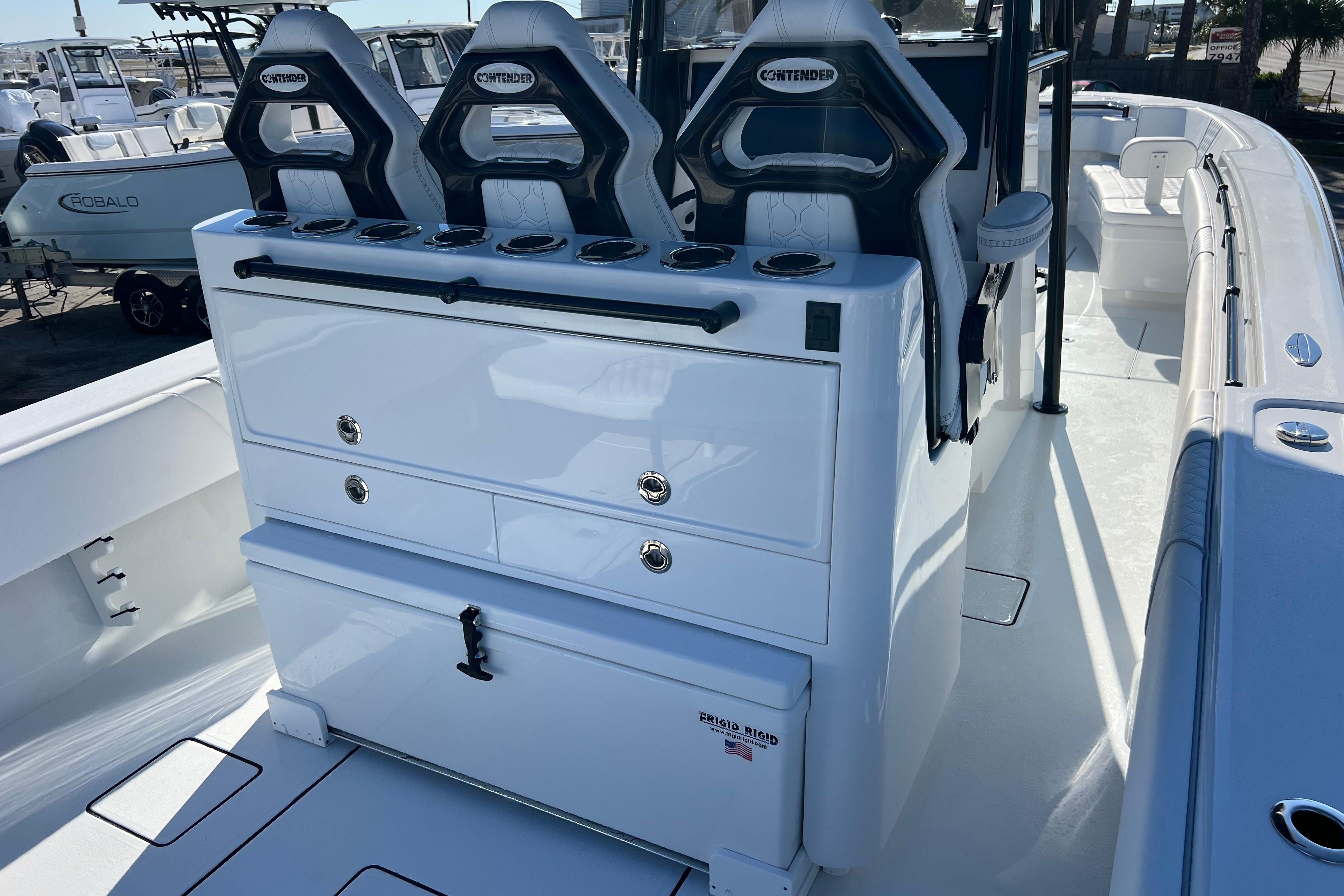 Looking for the ultimate in Fishability, Performance, and Comfort? Look no further than this stellar 2026 Contender 35ST! This boat is powered by Triple Yamaha F350 XSA motors with Yamaha Helm Master Joystick controls! The boat is Loaded with some incredible options including twin Garmin 9219 screens with a powerful GSD 28 sonar module, Llebrock Racing style helm seats, recessed Forward Seating, Forward lounge, cockpit coaming bolsters, Anchor Windlass & Electric Toilet. The boat has a beautiful Kingston Gray hull paired w/ Black powder coating. It really has an impressive look to it! Other stand out Options include, Gemlux Outrigger Bases, (2) Electric Reel Outlets, Transom Rod Rack, Stainless Pump Box System, & Shore Power. Call Erickson Marine in Sarasota, FL today for more information and to set up a sea trial. Contender has always been well known for producing some of the best performing center console fishing boats on the water, and the 35ST, goes beyond expectations. The innovative dual step design provides dramatic performance increases not only in speed, but also in fuel efficiency, and handling. The 35 Stepped hull’s one level deck, massive fish and storage boxes, and of course the incomparable ride, make this is a fisherman’s dream.