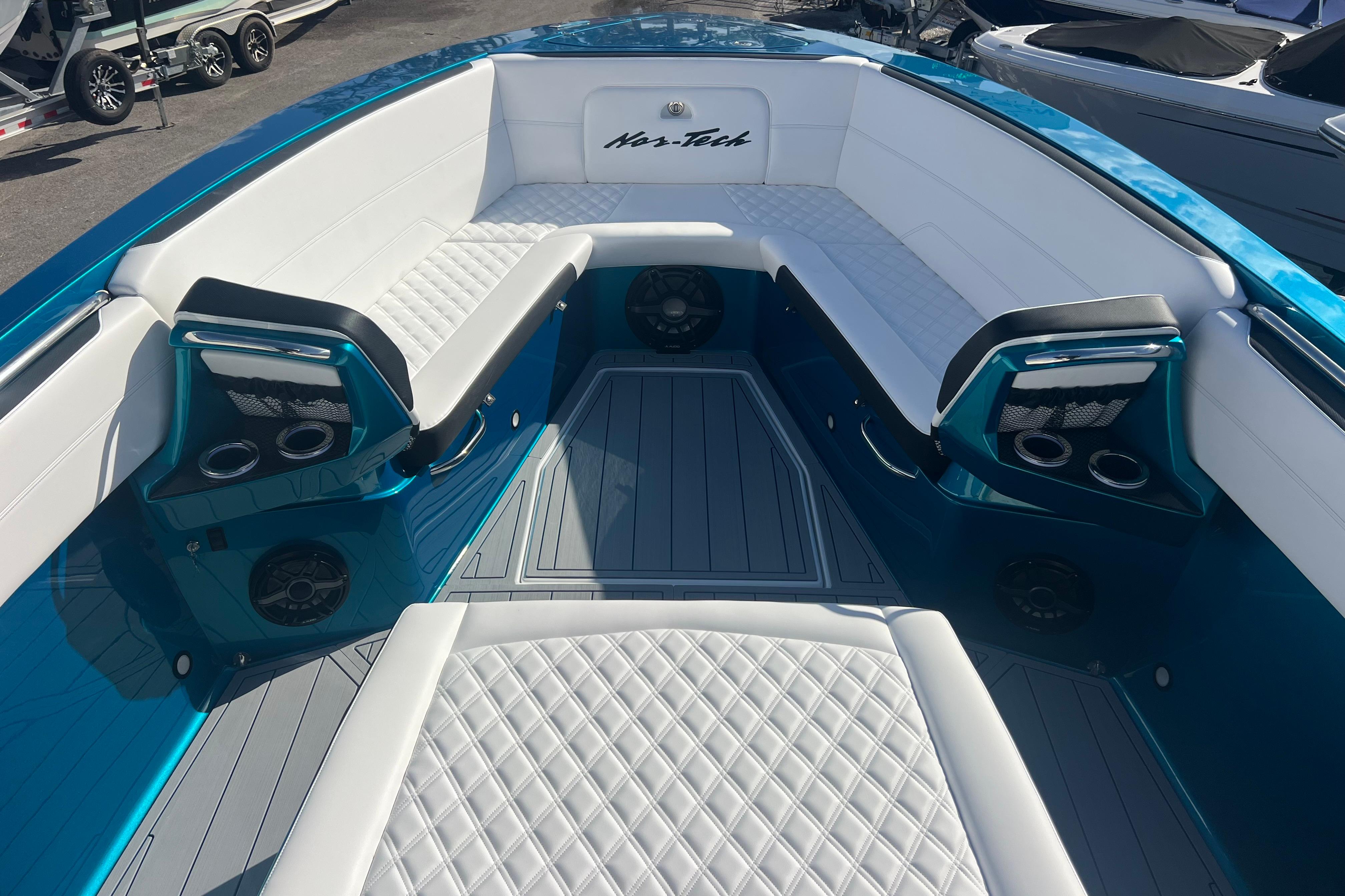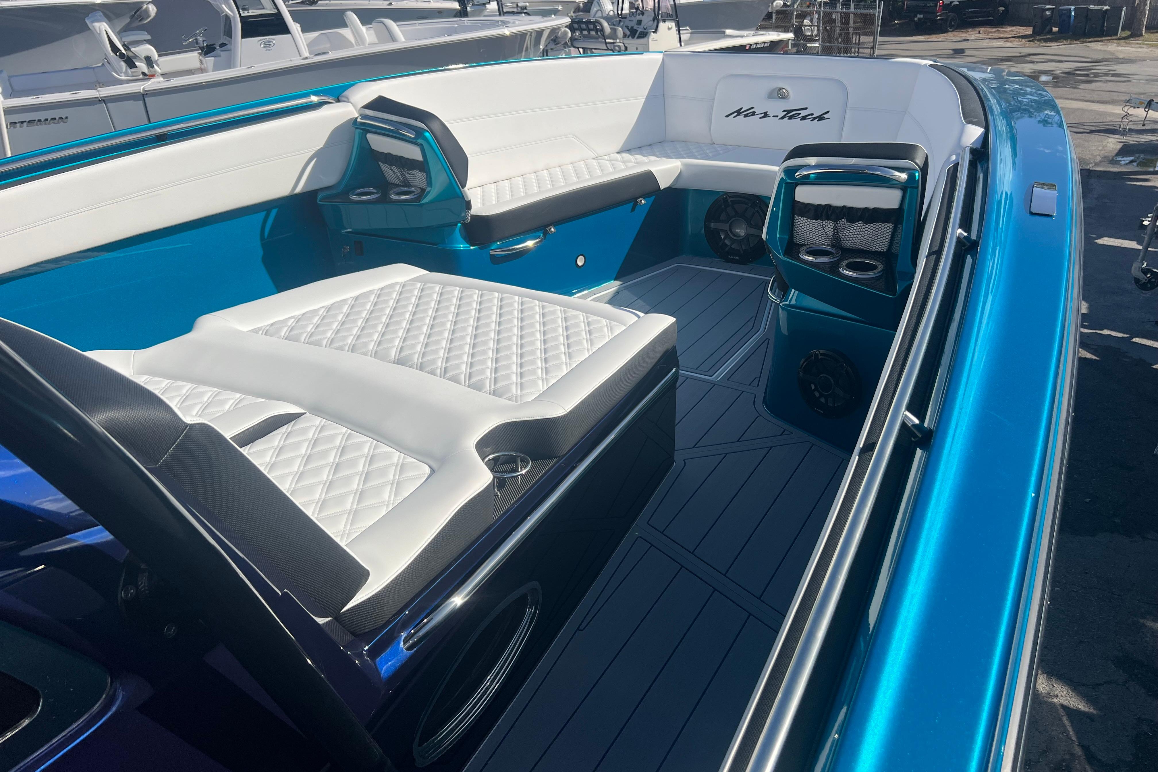 This Nor-Tech 390 Sport Center Console is available right now! It is absolutely beautiful and it is powered with Quad Mercury 400 HP Racing Engines. It has an incredible Graphics Package. This boat is loaded with options including Dual Row Seating, Bow Thruster, Garmin 9222's (22" Screens), Auto Pilot, Radar, and LED Light Bar, VHF Radio. The layout is awesome with the Second Row of Seats and the Club Sport Rear Seating you really have the most comfortable set up available. The Console has a cabin in it with a bed and Electric Toilet. It feels very open in there. the Bow area has a large Lounge and Forward Seating with an Electric Table. The boat is set up w/ the Coast Key Wireless Engine Lanyard w/ Remote Start / Stop, & Wireless Battery Switch Operation (No more turning multiple Battery Switches). This boat also has a Huge Stereo w/ LED Color Changing Lighting in the Speakers. RGB Lighting in the Cockpit as well. Other options include, XM Satellite Weather / Radio, Reverso Freshwater Flush System (Auto Flushing), Sea Deck Flooring, Windlass, & Marine Guardian Security System.